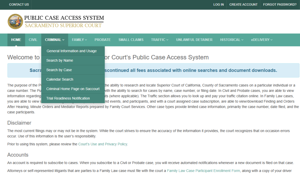 You will see the Sacramento Superior Court Public Case Access System with a top navigation menu. - Choose a case category from the menu